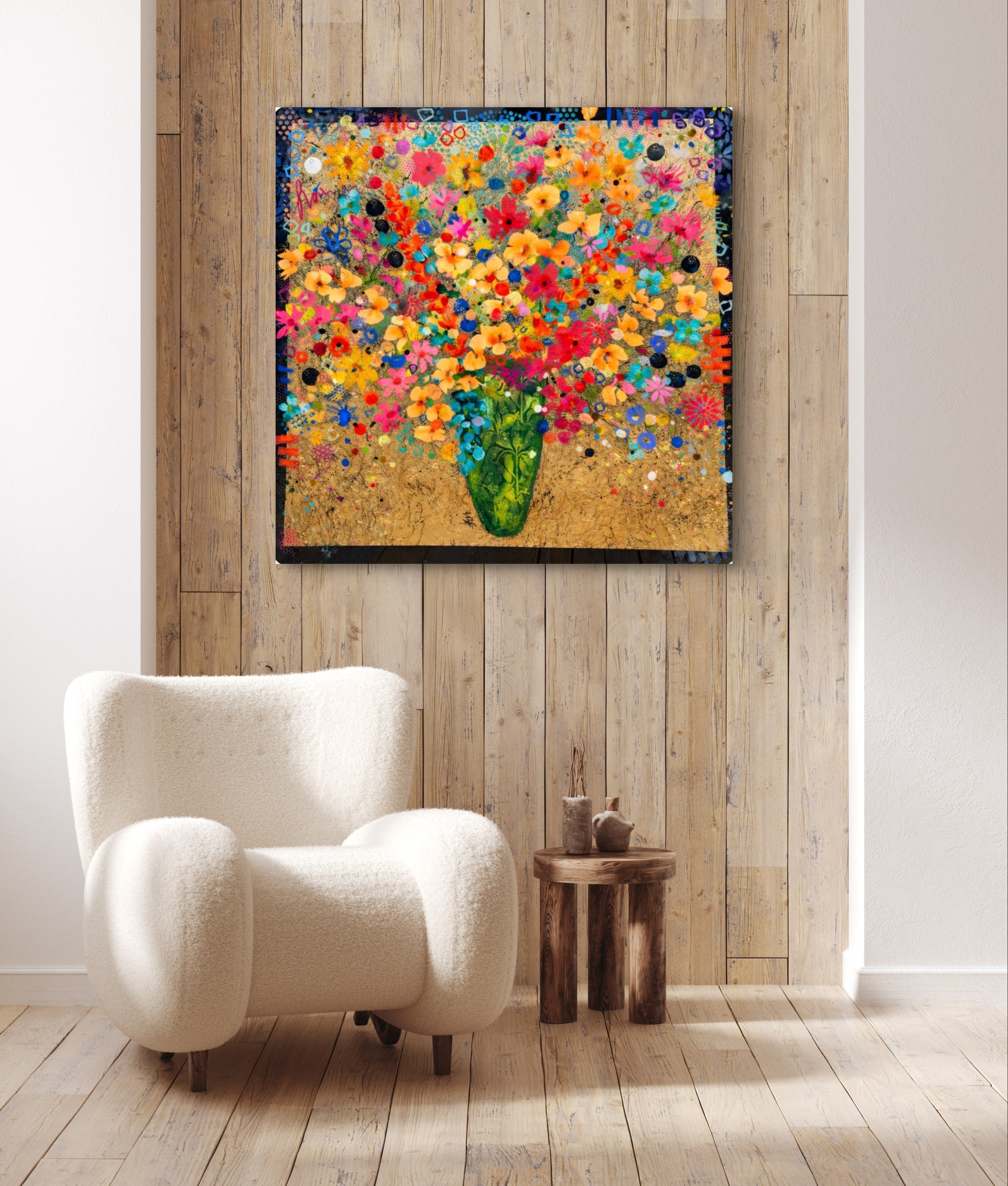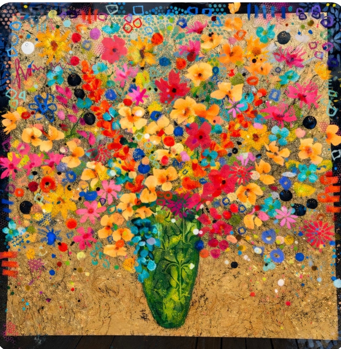 A joyful explosion of colour blooms from a lush green vase, dancing across a radiant gold-leaf backdrop. Layers of vibrant florals, playful marks, and confetti-like details create a whimsical garden that feels alive with movement, light, and pure happiness.