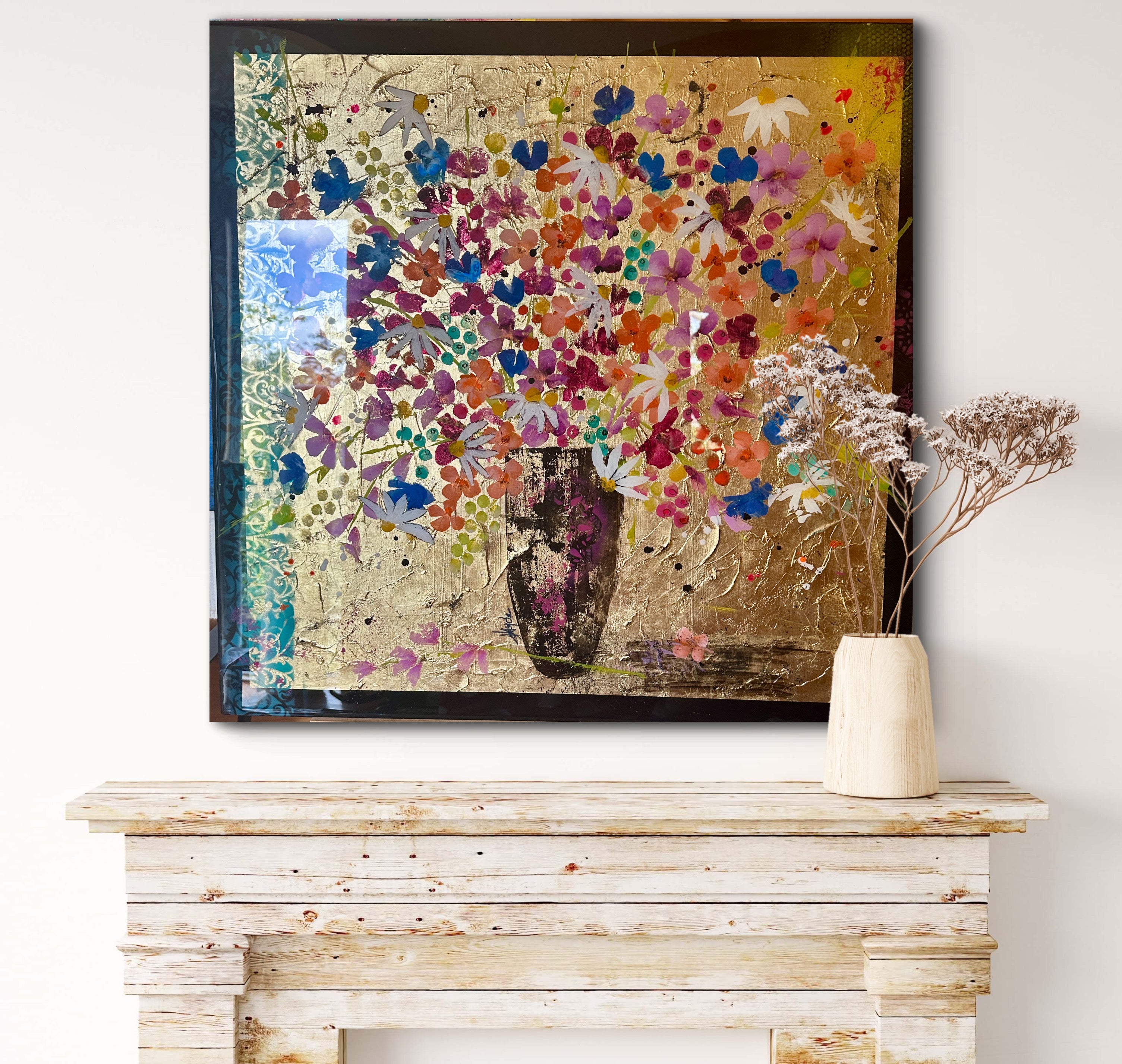 A celebration of abundance, movement, and colour, Sinfonia Di Fiori (Italian for Symphony of Flowers) bursts with joyful energy. This statement piece showcases a lush bouquet of vibrant blooms gathered in a textured vase, set against a radiant gold-leaf background that shimmers with life and light.